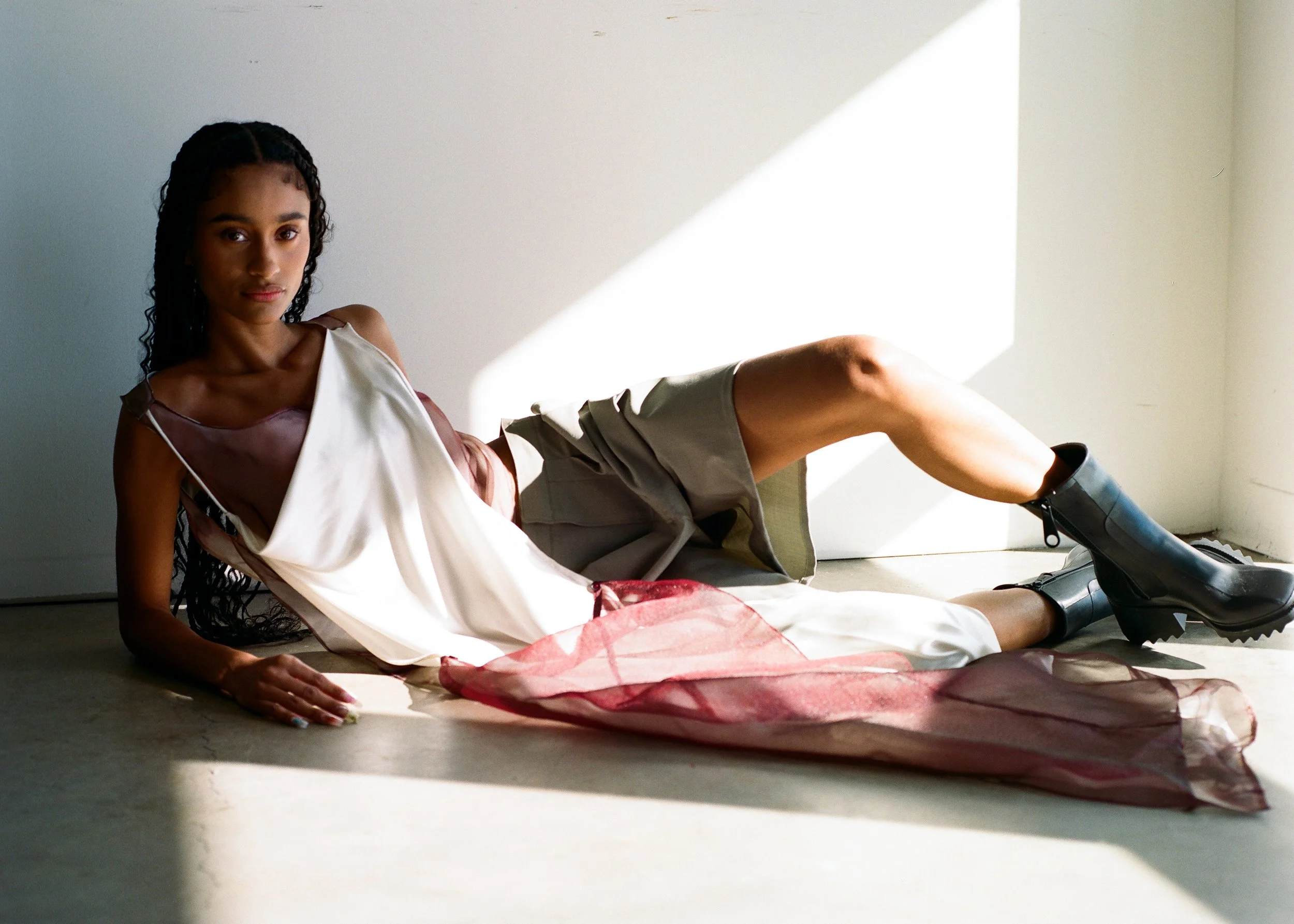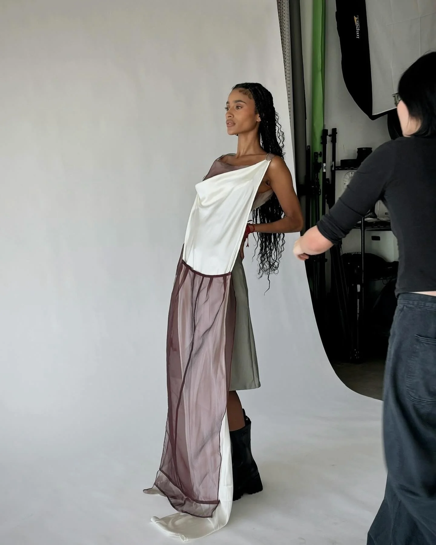BERMUDA PANTS & DRAPED CORSET Simple Structure made with Floating & Ruching Couture Draping During the Met Gala, a situation where wine spilled onto a slip dress. Backless Organza Slip Dress with Silk Slip Dress Attached An abstract print of spilled wine made on organza