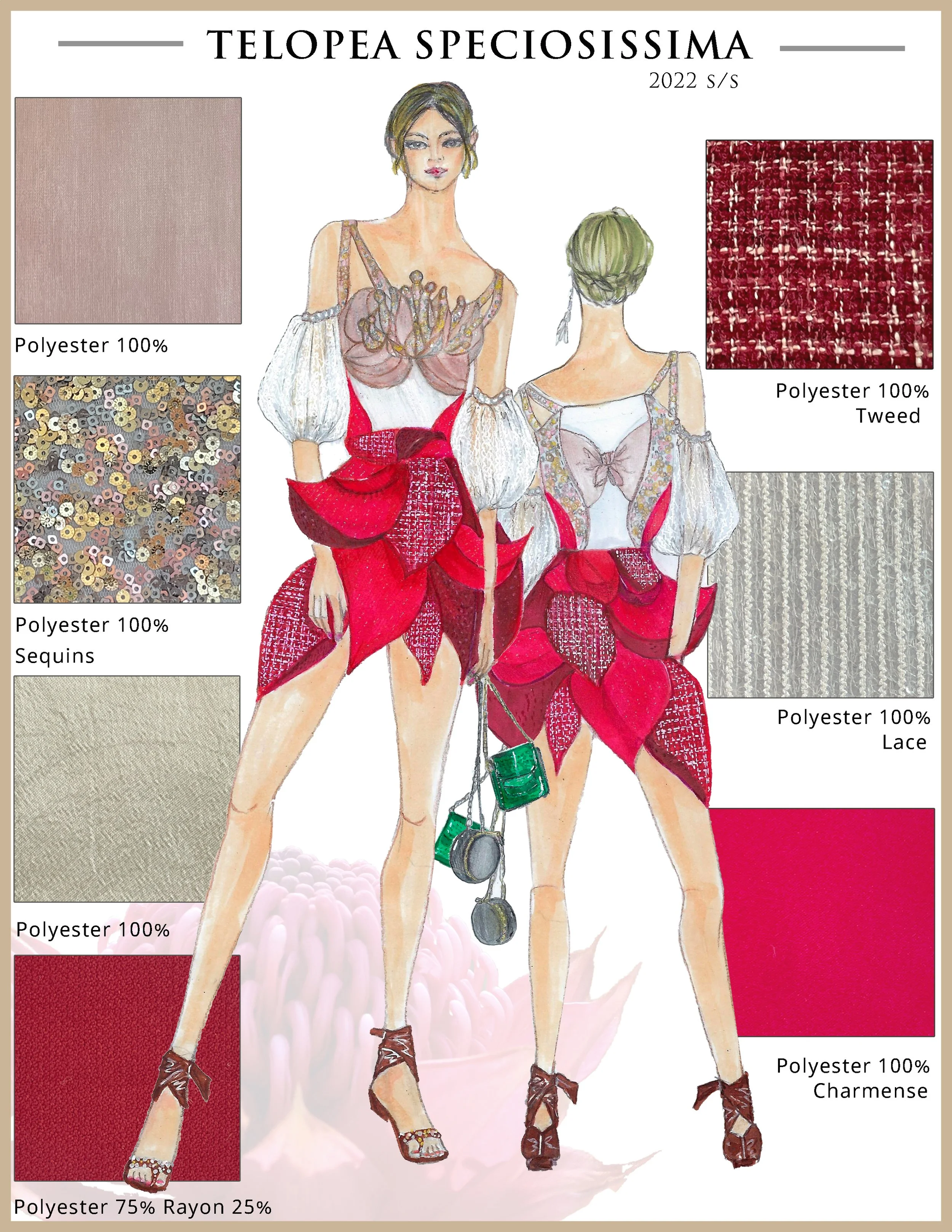 The sequins, tweeds, and lace, which capture the fierce red color of telopea speciosissima