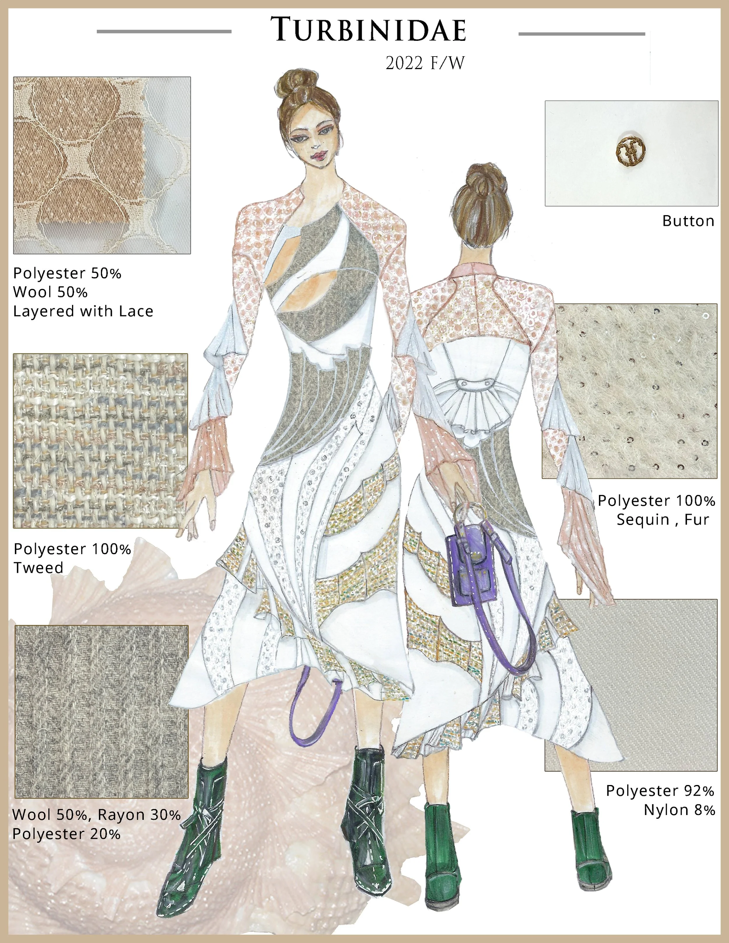 I used the spiral shell as a detail for the look to create a dress, wrapped in layers, and a bolero jacket with ruffle details.