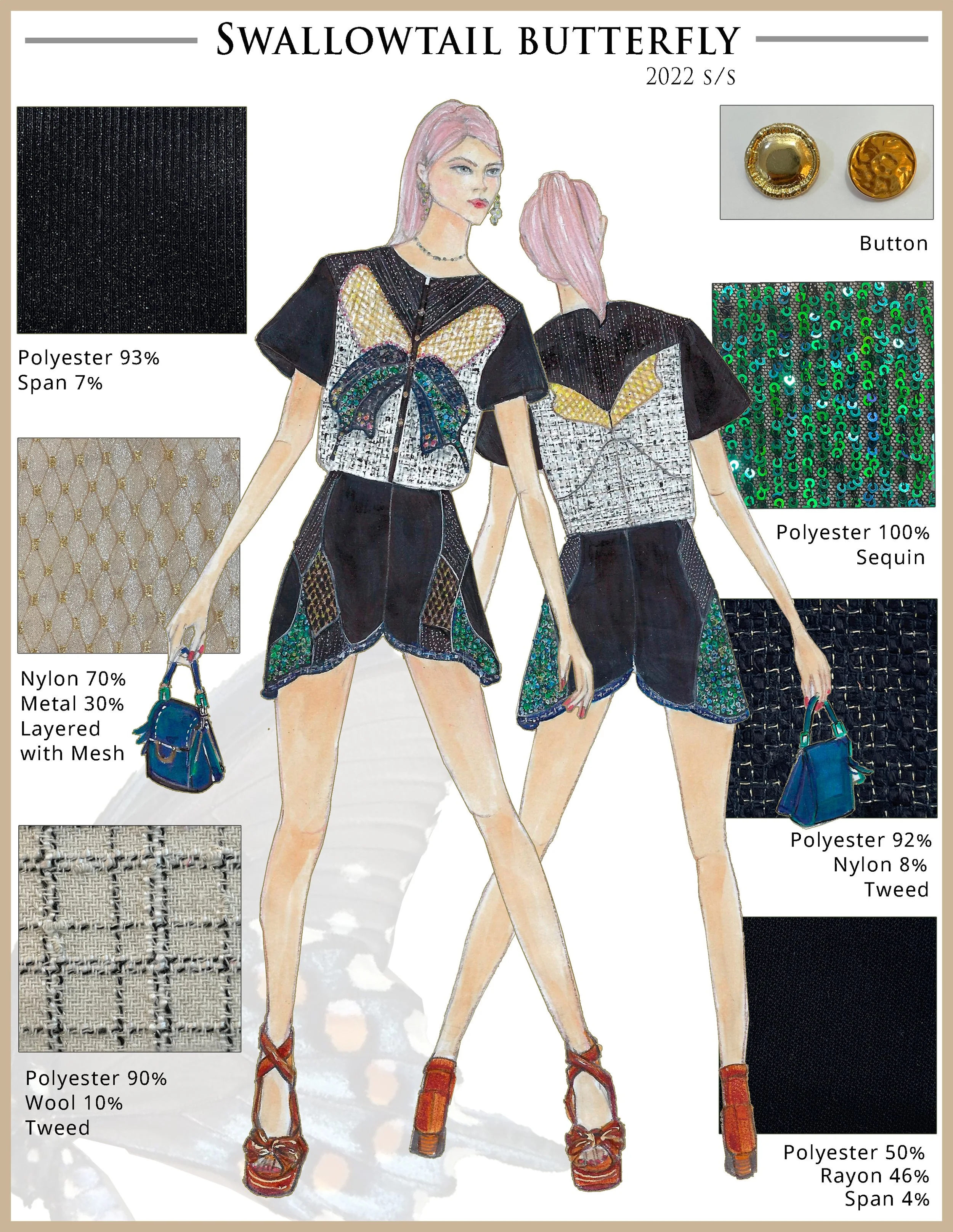 I designed a short top with bead detail and observed the delicate lines in the wings to design a pattern for the short pants. Using a shimmery sequin fabric with a metallic fabric filled with glitters,