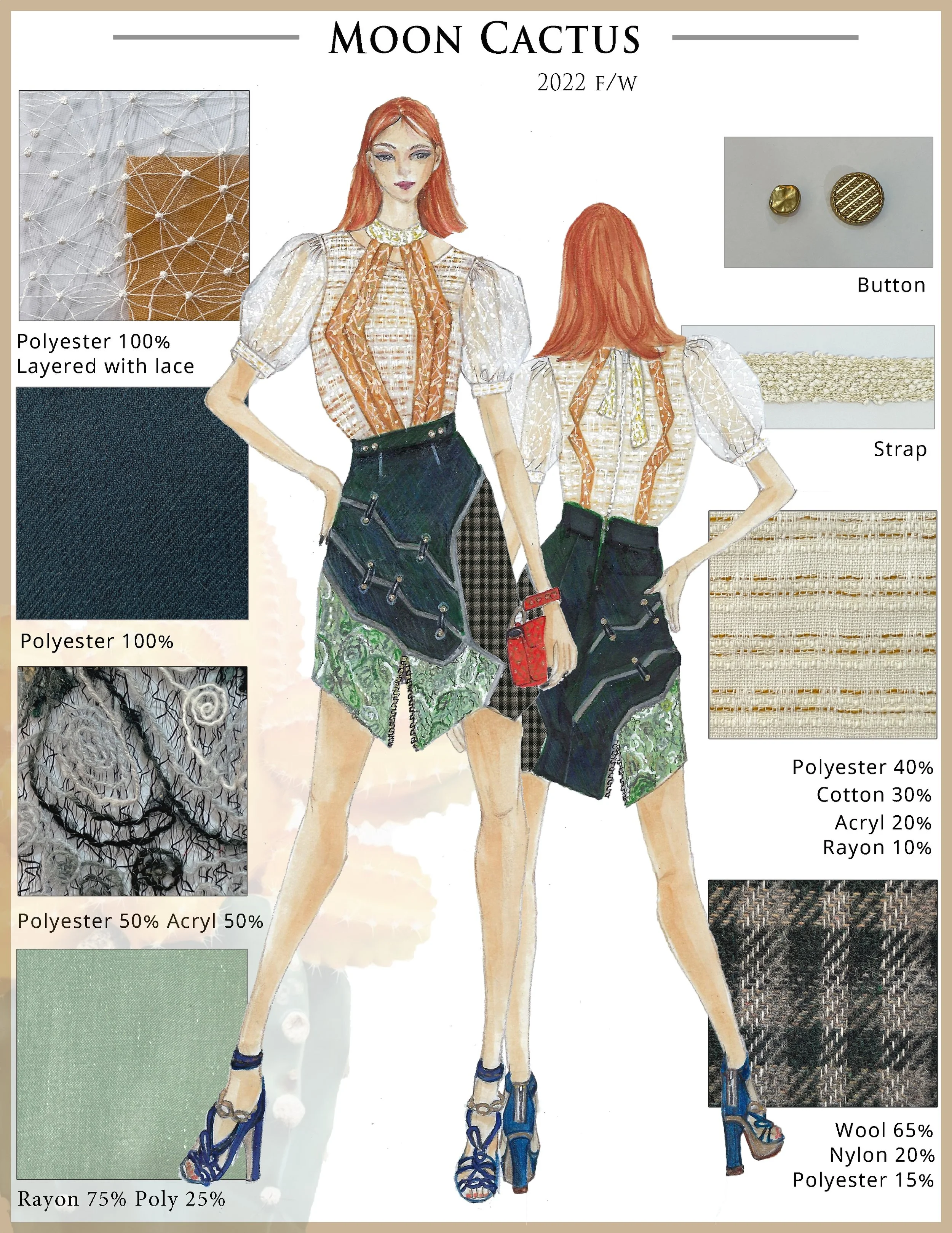 This illustration is results of various fashion croquis by drawing specific features of nature, architecture, automobiles, and cathedrals to the clothing details.